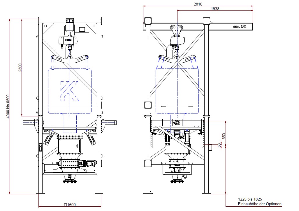 - Entleerung handelsüblicher Big Bags bis 2.000 kg über stabiles Lastkreuz mit Kraneinhebung